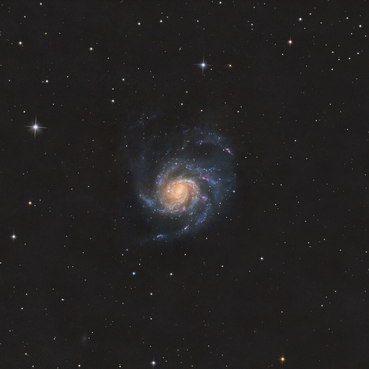M101 е спирална галактика, разположена на около 21 милиона светлинни години от Земята в съзвездието Голяма мечка. Тя съдържа стотици милиарди звезди и се отличава с широки, неравномерни спирални ръкави, богати на области на активно звездообразуване.