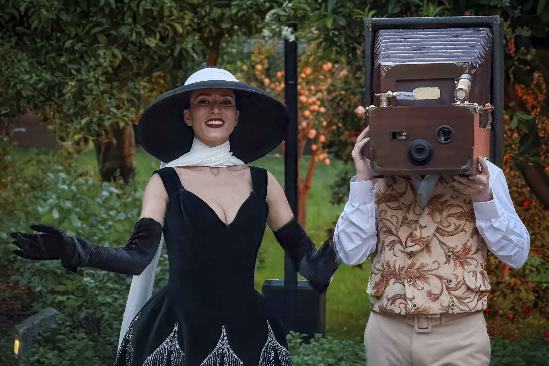 Малка атракцийка в декора на един изискан прием. Нещо като живи 'статуи' тук-там из градината: тя 'снима' гостите, а той Е камерата (и раздават полароиди)...