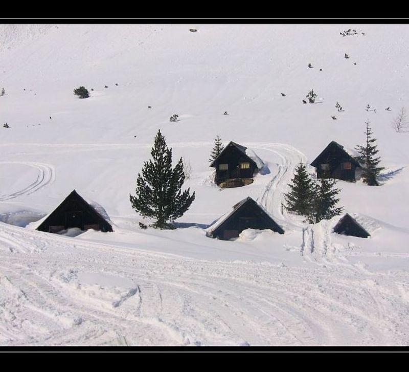 Kam vtora terasa na vrah "Maliovica".Bungalata se namirat neposredstveno do hija "Maliovica".To4no po tova vreme minalata godina tezi bungala bqha po4ti celite pod snega.Gore v lqvo se vijda 4ast na edna ot mnogoto padnali lavini