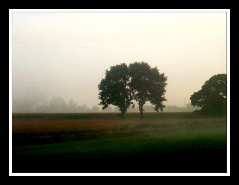 дърветата летят в мъглата край влака