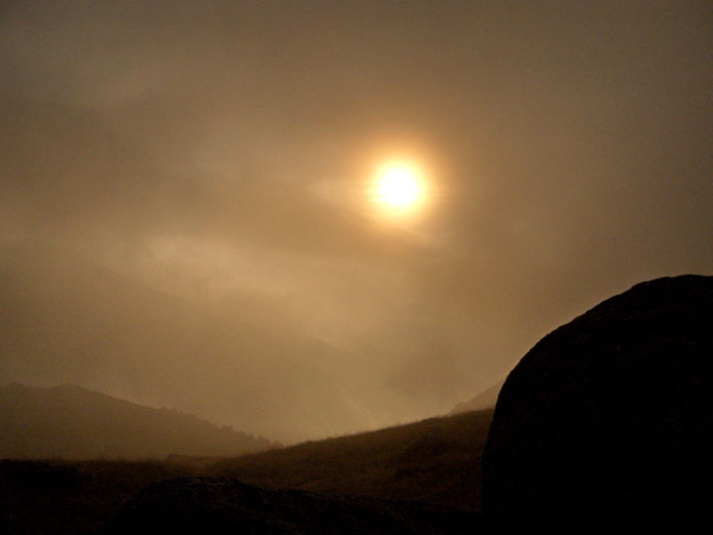 слънчево затъмнение, причинено от гъстата мъгла високо в Рила