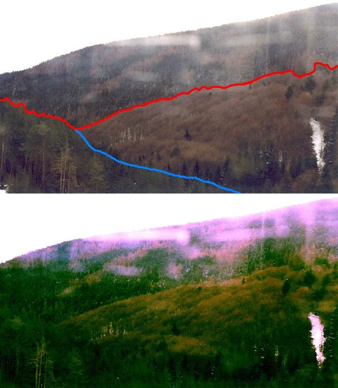 Засегнатия смърчов масив е над червената линия. В ляво от Синята е боров масив, а между двете е широколистна гора с малко иглолистни дървета, изглежда - смърч.