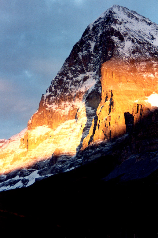 Tove e Severnata stena na vruch "Eiger" v Alpite. Edin ot redkite momenti, kogato e ogrjana ot slunceto. Tova trae samo njakolko minuti na zalez v nachaloto na Oktomvri.