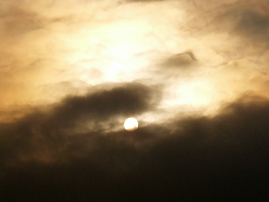Интересния залез погледнат от обектива през облаци и мъгла придава на Слънцето видя на Луната
