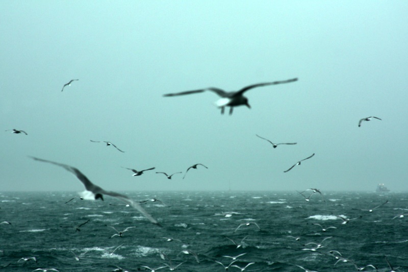 Whittier, Alaska. В пълен контраст от предишния ден, този предлагаше бурен вятър и вода в изобилие. На тези птици, като че не им правеше впечатление, че небето е спукано и се надпреварваха с един тюлен да се гмуркат в студеното море преследвайки някаква риба.