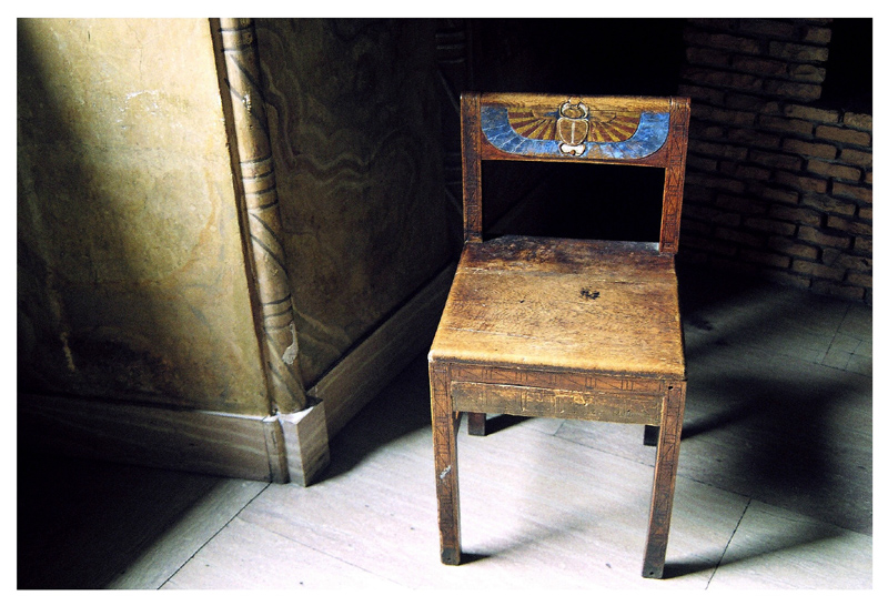 Изображението на облегалката на стола е на скарабея Хефри или Кефер.