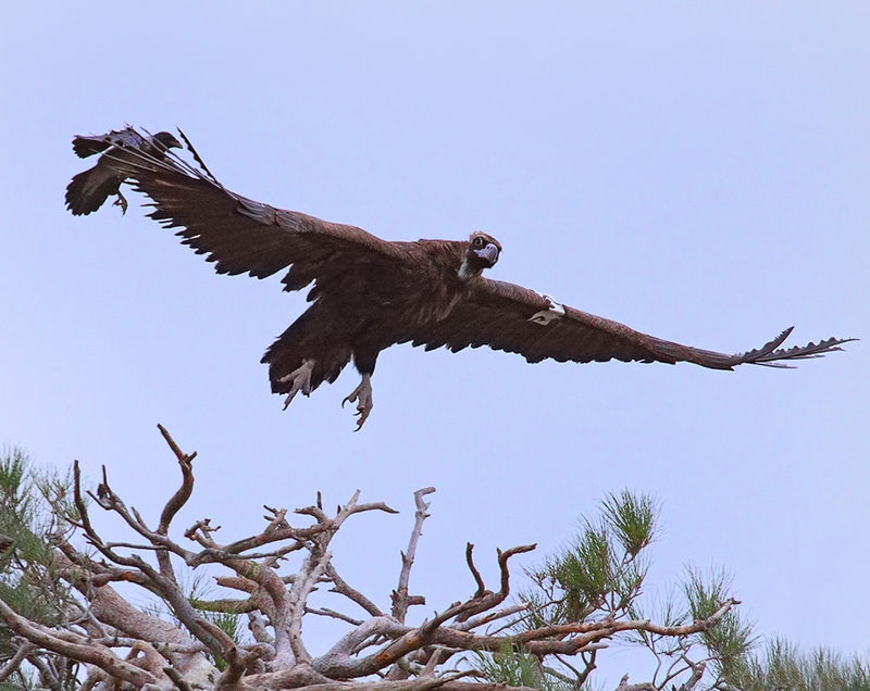 Странна гледка: огромният черен лешояд (Aegypius monachus) бяга от многократно по-малката от него сива врана (Corvus cornix), която настървено го преследва, след като преди това го накълва яростно по опашната част