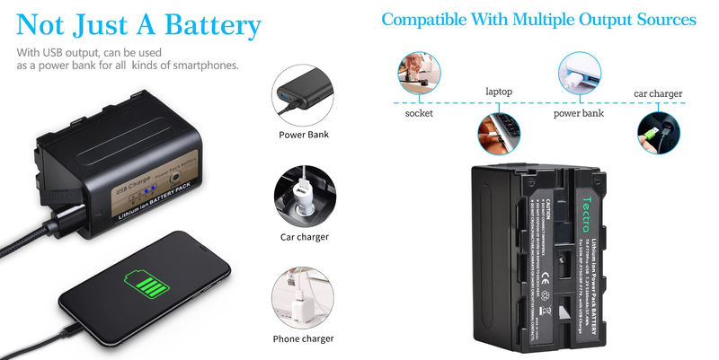 В комплекта е включен кабел с USB накрайник чрез който батерията може да бъде заредена от всяко устройство с USB изход. Също така може да бъде използвана като външна батерия.