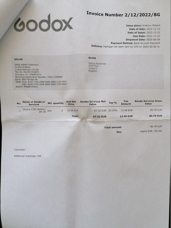 Батерията е закупена от godox.eu