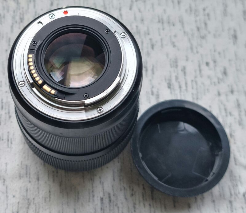 ЗАЩО в конкретният случай? Дълго време това бе моята лично ползвана бройка и в сервиз просто си оставих този ринг вместо друг здрав такъв, който използвах за продаването на друга бройка в отлично визуално състояние. Съответно обективът не е изпускан или удрян. Запазена оптика с изключение на някоя друга прашинка под лещите и едно често срещано поизтриване на черното покритие на вътрешните рингове около лещата - никакво влияние. Заедно с 2 капачки.