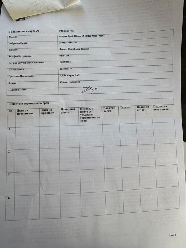 Продавам iPhone 13 midnight 128 Gb, закупен от А1 на 24.03.2025 г., с гаранция до 24.03.2027 г. 100 % живот на батерията; 21 цикъла на зареждане; Privacy стъкло; силиконов гръб от самото начало. Просто си купих iPhone 15 Pro и ми е излишен 13.
