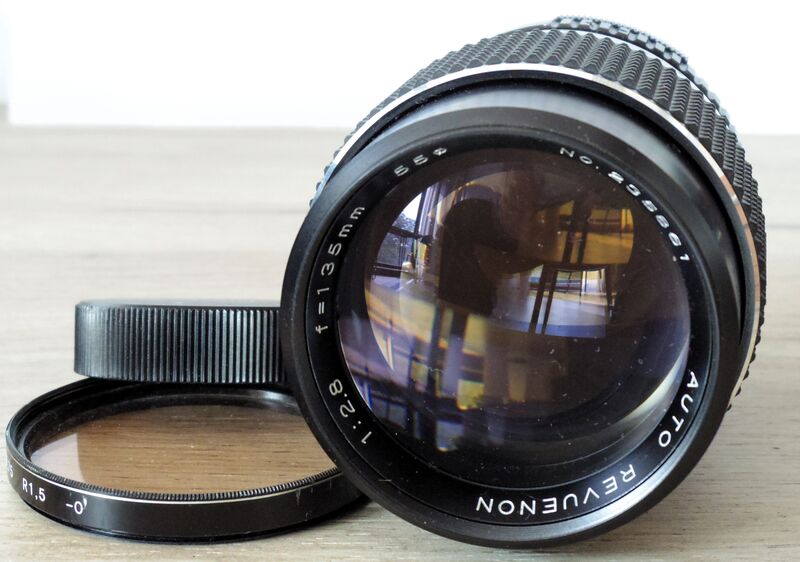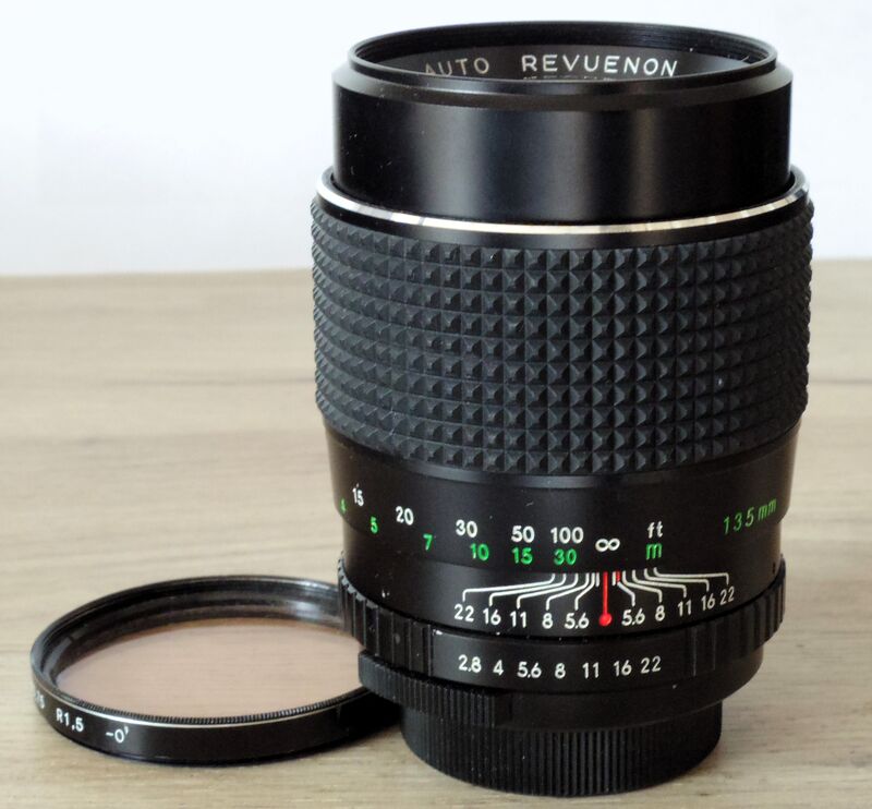 Auto Revuenon 135/2.8 на резба М42. М и А превключвател. Много добро състояние. Корпус без следи от употреба, чиста оптика, безупречни ход фокус и бленда в двете позиции. Резба за филтър 55 мм. Задна капачка, филтър вместо предна. 60 лева.