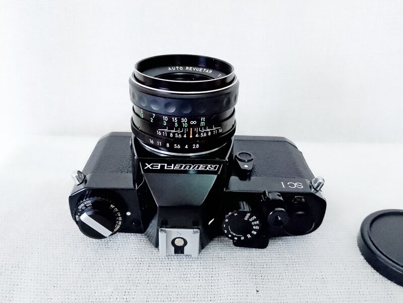 Идва в комплект с японски обектив - Auto Revuenon 50/2.8 . Вероятен производител - Томиока или Косина . Отлично състояние , както външно така и функционално. Чиста оптика, неомаслени ламели, лек и "мазен" ход на бленда. Предна капачка.