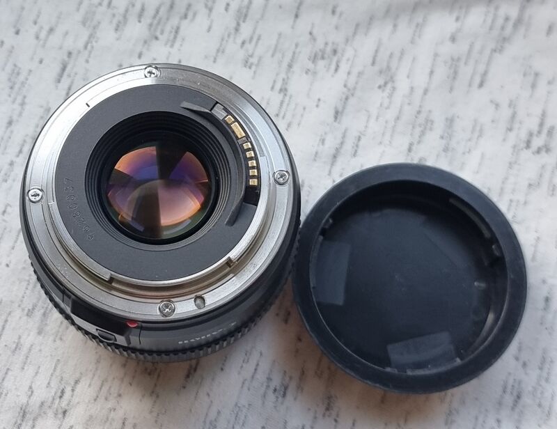 Продава се този доста приятен широк и светъл фулфрейм обектив в много добро функционално и добро визуално състояние. В едната крайна периферна зона на челна леща има група от изцяло и само повърхностни драскотинки/протривания, а под самата леща отново в периферията основно група от оталожени прашинки - и двете забележки без влияние. Някои нормални козметични следи от ползване по корпуса. Заедно с 2 капачки.