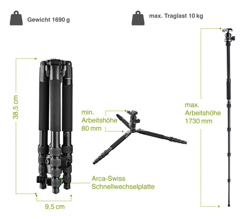 Опция монопод: един от краката може да се отвинти и заедно с централната конзола да се превърне в монопод над 170см. В стандартен режим също максимумът е над 170см.