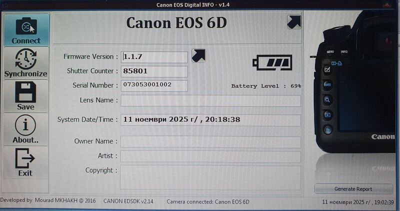 Продавам употребяван Canon 6D на 86 000 сработвания на затвора.
