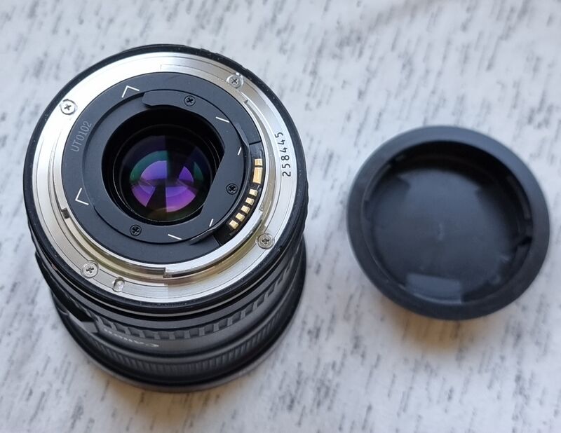 Продава се този популярен широк обектив в общо отлично функционално и много добро визуално състояние. Някои леки до нормални козметични следи от ползване по корпуса. Единствено по-видими следи от ползване по сенника - без влияние. Запазена оптика с изключение на някоя друга мъничка прашинка под лещите. Оптически добра бройка. Заедно с 2 капачки и сенник.