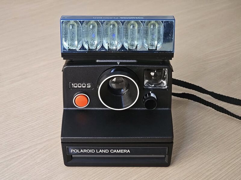 Продавам класически моментен фотоапарат Polaroid 1000S, произведен в средата на 70-те години, в изключително запазено състояние. Подарък: Sylvania Flash Bar (светкавица за еднократна употреба) с 6 неизчерпани светвания.