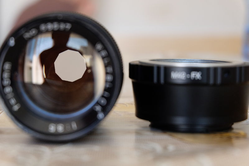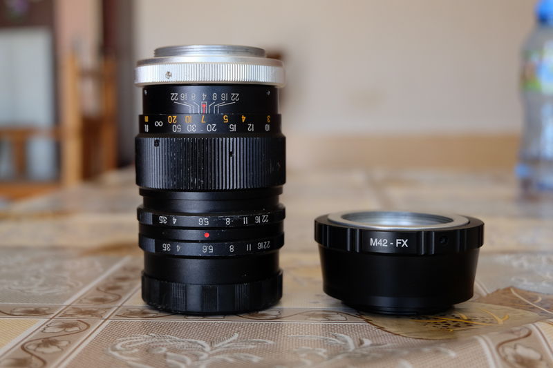 преходник m42-FX и обектив weltblick 1/3.5 135mm 10 ламелна бленда с забележки по външния вид , но с чисти лещи без драскотини и чиста бленда.