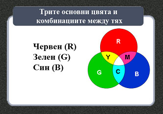 на основните цветове – червен, зелен и син. В комбинация помежду