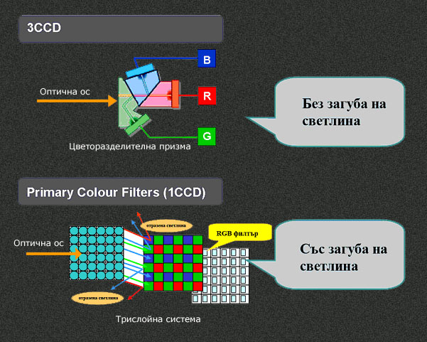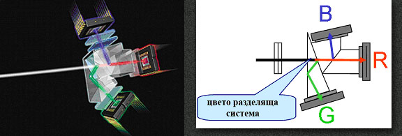 цвята и ги изпраща към три отделни CCD сензора всеки, от които чувствителен